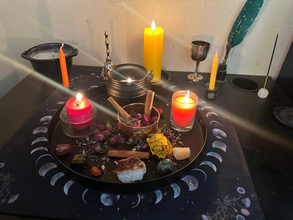 I like to use the energy of this day to cast self-love spells, as that is an area of my life that I struggle with. Whereas my best friend, also a witch, likes to use the energy of the day in her baking. In other parts of the world, bonfires are lit and danced around to celebrate the abundance of light and heat of the day. I love this tradition, and would gladly participate if it weren’t going to be 110 degrees (Fahrenheit) today. When we finally migrate north upon retirement, I will absolutely participate! Instead, I put a tealight candle inside of my mini-cauldron to mimic a bonfire.